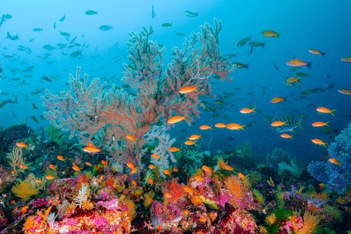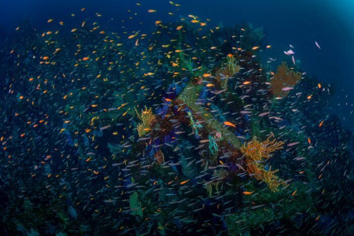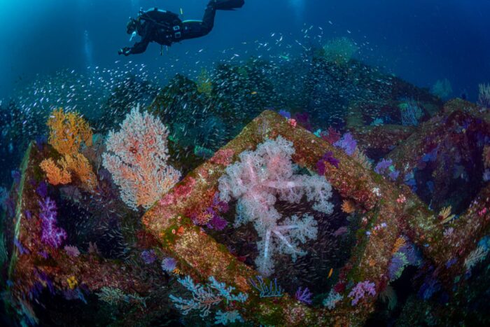人工魚礁にたくさんのソフトコーラルが付き、その周りの魚影はまさに圧巻!